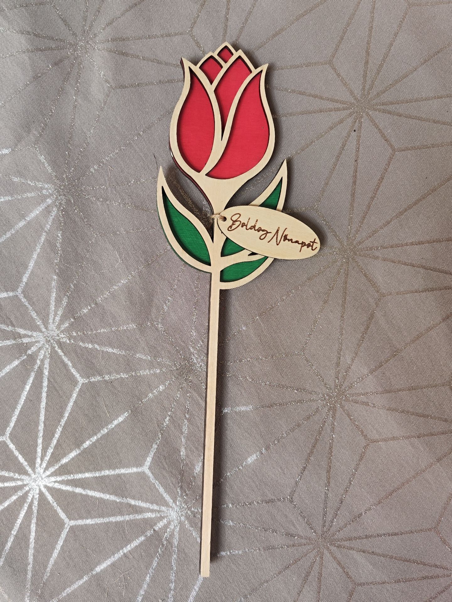 Lézervágott technológiával készült, kétrétegű, festett és ragasztott fa tulipán „Boldog Nőnapot” felirattal.