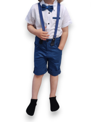 Fehéren kék apró mintás rövid ujjú ing csokornyakkendővel és egy gumis derekú kék térdnadrág, legombolható nadrágtartóval egy szettben. Esküvőre vagy igazi ünnepi pillanatokra, hogy a család minden tagja kényelmesen elegáns lehessen.