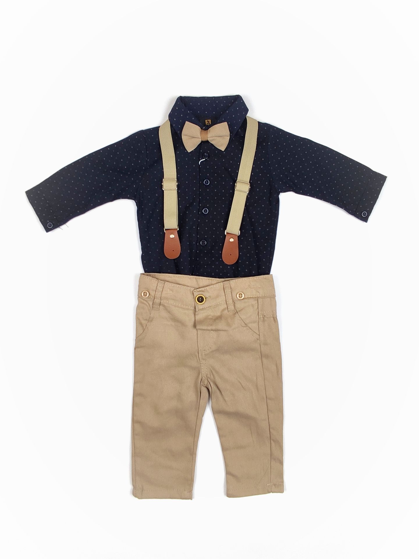 Fiú alkalmi szett – Bézs nadrág, sötétkék ing, csokornyakkendő és nadrágtartó (4 részes)