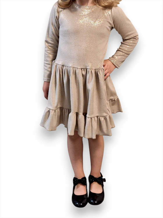 Ez a arany színű alkalmi ruha A-vonalú szabásával kényelmes és elegáns választás minden különleges alkalomra. A ruhát a finoman csillogó, különleges textil teszi igazán egyedivé, amely visszafogott fényével elegáns megjelenést ad a kislányoknak.