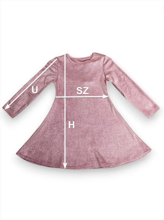 Ez a halványrózsaszín alkalmi ruha A-vonalú szabásával kényelmes és elegáns választás minden különleges alkalomra. A ruhát a finoman csillogó, különleges textil teszi igazán egyedivé, amely visszafogott fényével elegáns megjelenést ad a kislányoknak.