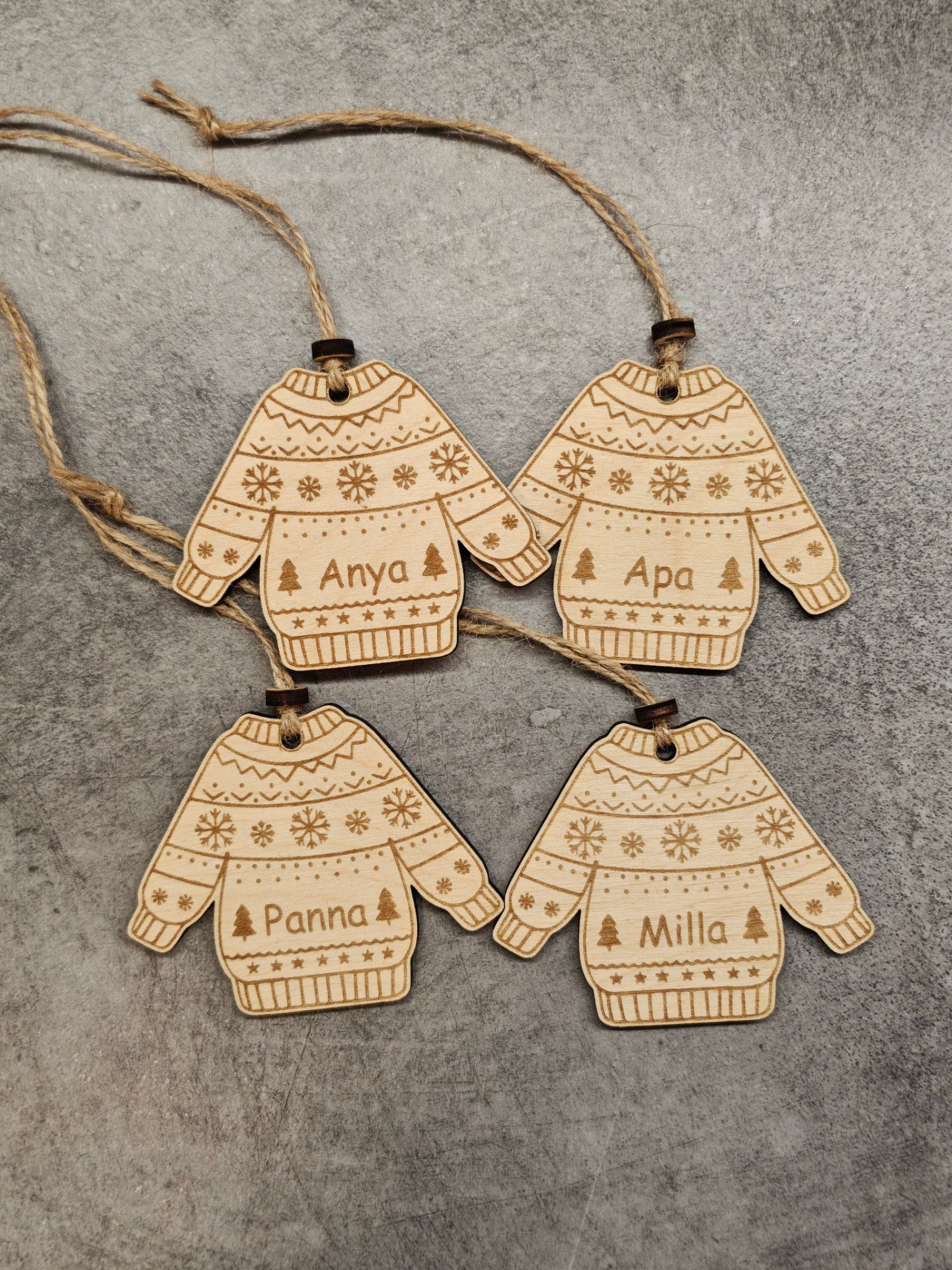 Lézervágott fa ajándékcímke, 8×6 cm méretben. Klasszikus kötött pulóver minta-val gravírozva, névre szóló személyre szabással. Egy csomag 4 darab címkét tartalmaz, fonál akasztóval — stílusos kiegészítő minden karácsonyi ajándékhoz. Minden további címke +500 Ft