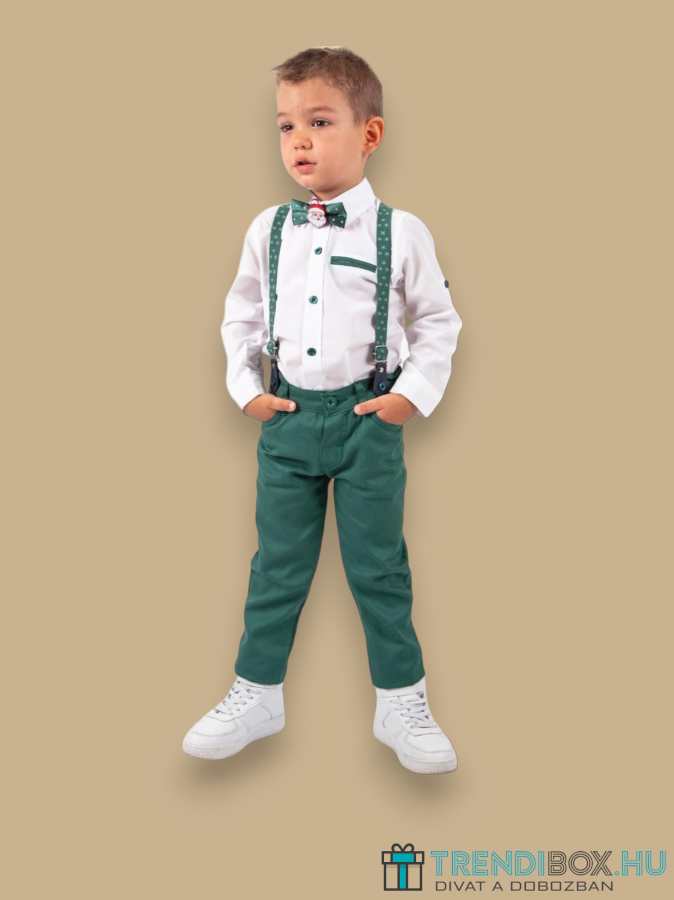 Fehér ing zöld gombokkal és egy állítható derekú zöld nadrág, zöld Mikulásos csokornyakkendővel, és zöld hópihés nadrátartóval egy szettben. Fotózásra, ünnepi pillanatokra, hogy a család minden tagja kényelmesen elegáns lehessen.